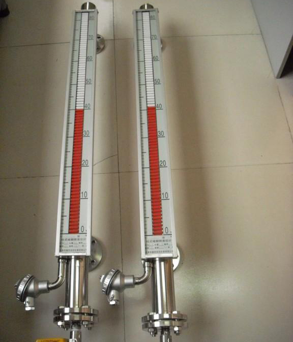 液位計(jì)根據(jù)浮力原理,浮子在測量管內(nèi)隨液位的升降而上下移動,浮子內(nèi)的永久磁鋼通過磁耦合作用,驅(qū)動紅、白色翻柱翻轉(zhuǎn)180’液位上升時,翻柱由白色轉(zhuǎn)為紅色,下降時,翻柱由紅色轉(zhuǎn)為白色,從而實(shí)現(xiàn)液位的指示。