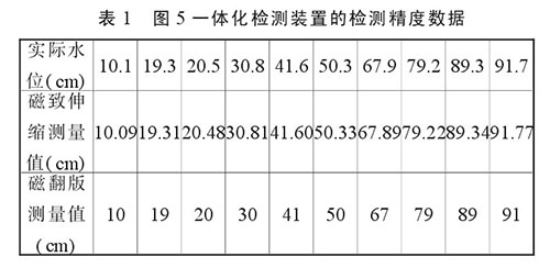 我們把圖5所示的一體化檢測裝置進(jìn)行了水位檢測實(shí)驗(yàn),其檢測結(jié)果與實(shí)際水位值見表