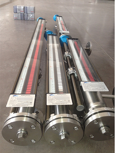 液位計根據(jù)浮力原理,浮子在測量管內(nèi)隨液位的升降而上下移動,浮子內(nèi)的永久磁鋼通過磁耦合作用,驅(qū)動紅、白色翻柱翻轉(zhuǎn)180’液位上升時,翻柱由白色轉(zhuǎn)為紅色,下降時,翻柱由紅色轉(zhuǎn)為白色,從而實現(xiàn)液位的指示。