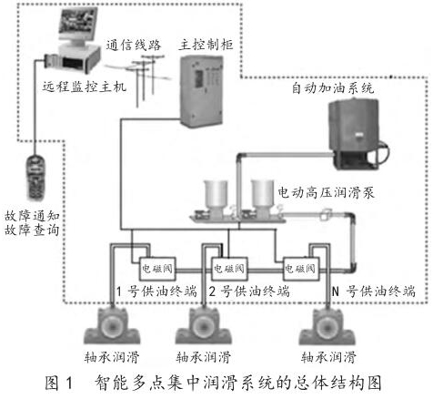 該智能多點集中潤滑系統(tǒng)由以下幾部分組成:電控系統(tǒng)、供脂系統(tǒng)、補脂系統(tǒng)、檢測及信號線路。智能多點集中潤滑系統(tǒng)總體結(jié)構(gòu)圖如圖 1 所示