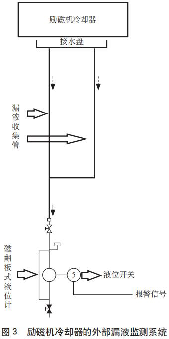 實(shí)際運(yùn)行經(jīng)驗(yàn)表明,側(cè)裝式磁翻板液位計(jì)內(nèi)部銅管發(fā)生泄漏的概率較低,但一旦發(fā)生泄漏,漏液會(huì)隨著冷卻空氣沿閉合風(fēng)路進(jìn)入勵(lì)磁機(jī)內(nèi)部,造成勵(lì)磁機(jī)短路損壞的嚴(yán)重后果。為了保證機(jī)組安全,應(yīng)有冷卻器內(nèi)部銅管泄漏監(jiān)測裝置,然而現(xiàn)場沒有配置此類裝置。
