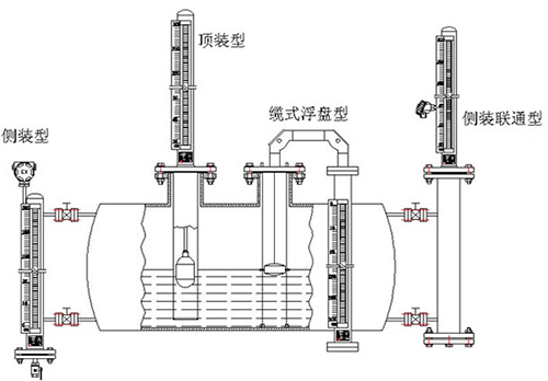A 型頂裝式遠傳磁浮子液位計分為上下兩部分,上部在容器頂部,下部安裝在容器內(nèi),由法蘭與容器法蘭連接。液下部分導(dǎo)管內(nèi)浮子由連桿與上部導(dǎo)管內(nèi)磁性頭連成一體。當(dāng)液體變化時,浮子帶動磁鋼在導(dǎo)管內(nèi)上下運動,帶動顯示部分紅白指示球翻轉(zhuǎn),在面板上讀得液位高度。