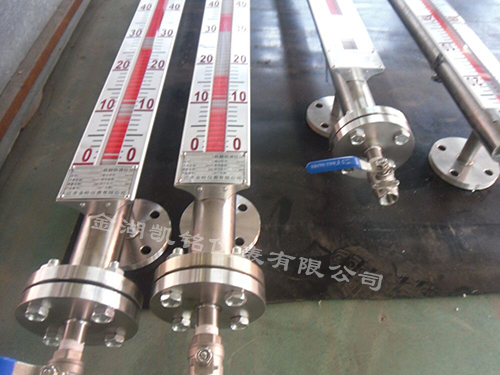 液位計根據(jù)浮力原理,浮子在測量管內(nèi)隨液位的升降而上下移動,浮子內(nèi)的永久磁鋼通過磁耦合作用,驅動紅、白色翻柱翻轉180’液位上升時,翻柱由白色轉為紅色,下降時,翻柱由紅色轉為白色,從而實現(xiàn)液位的指示。