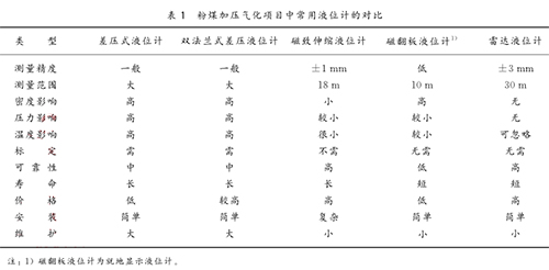 目前在粉煤加壓氣化項(xiàng)目中常采用的液位計(jì)類型主要有:差壓式液位計(jì)、雙法蘭式差壓液位計(jì)、磁致伸縮液位計(jì)、磁翻板液位計(jì)、雷達(dá)液位計(jì)等。這幾種液位計(jì)各有特色,都存在著一定的優(yōu)勢與不足,性能對比結(jié)果見表1所列。