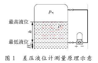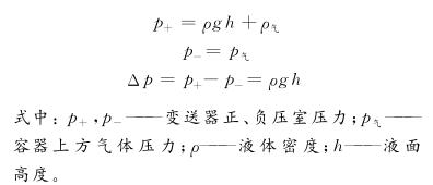 在粉煤加壓氣化工藝流程中,冷卻水、冷凝水是干凈潔凈的介質(zhì),測量該介質(zhì)的液位如無特殊情況,選用普通的差壓式液位計(jì)即可。差壓式液位計(jì)是利用流體靜力學(xué)原理,通過測量流體的壓差來計(jì)算出液位的高低,其測量原理如圖1所示。這種方法簡捷、方便,但是準(zhǔn)確度與穩(wěn)定性不高,而且測量結(jié)果受到介質(zhì)密度的影響,為滿足測量精度常需要進(jìn)行補(bǔ)償或采用組合式儀表測量方案。