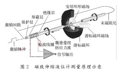 這樣的選型設(shè)計(jì),雖然能夠滿足測量準(zhǔn)確度的要求,但相應(yīng)增加了購置成本,并且根據(jù)項(xiàng)目應(yīng)用的實(shí)際反饋,現(xiàn)場存在泄漏點(diǎn)多、安裝與維護(hù)較復(fù)雜等問題。因此在新的伊泰杭錦旗項(xiàng)目中,由于項(xiàng)目所在地的晝夜溫差較大,冬季環(huán)境溫度*低,改用側(cè)裝3臺磁致伸縮式液位計(jì)并配磁翻柱顯示器來替代原先的差壓式測量方案。磁致伸縮式液位計(jì)主要依據(jù)磁致伸縮原理而工作,工作原理如圖2所示,由傳感器電路沿磁致伸縮線(波導(dǎo)絲)發(fā)出電流脈沖,在磁致伸縮線周圍形成環(huán)形磁場,當(dāng)其與浮子內(nèi)的永磁鐵產(chǎn)生的縱向磁場發(fā)生疊加時(shí),會在浮子位置產(chǎn)生1個(gè)扭轉(zhuǎn)脈沖回傳至傳感器的探頭。測量起始脈沖與返回脈沖的時(shí)間差來確定浮子的位置,即液面的位置。磁致伸縮液位計(jì)具有精度高、使用壽命長、無需調(diào)零校準(zhǔn)、易維護(hù)、安全性高等優(yōu)點(diǎn),但是在安裝時(shí)要注意:探測桿要保證垂直,不能折彎;做好接地屏蔽工作,以免電磁干擾影響測量效果。