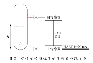 c)對膜片的材質(zhì)要求較高。為防止腐蝕與氫脆現(xiàn)象,需要選用316L鍍金膜片,成本較高。同時(shí)由于介質(zhì)的易沉積性,在加裝沖洗吹掃裝置后,仍然需要定期清理更換膜片,以保證測量精度。2)改進(jìn)的電子遠(yuǎn)傳液位變送器。在后續(xù)的項(xiàng)目中采用改進(jìn)的電子遠(yuǎn)傳液位變送器,其測量原理如圖3所示。該種電子遠(yuǎn)傳液位變送器取消了傳統(tǒng)的毛細(xì)管引壓方式,使用主、副2個(gè)壓力傳感器,分別安裝于容器的底部與上方,用來測量高低壓側(cè)的壓力。2個(gè)壓力傳感器以CAN總線的方式連接到一起,并且將副傳感器接收到的壓力信號傳至主傳感器中進(jìn)行差壓計(jì)算,計(jì)算完成后轉(zhuǎn)換成標(biāo)準(zhǔn)的4~20mA信號輸出。